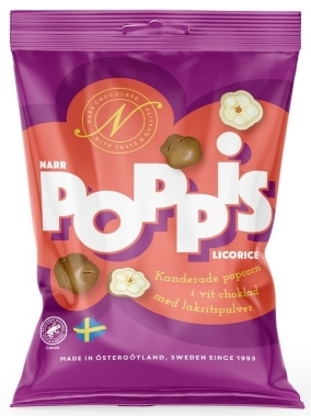 Description: Candied popcorn (30 %) covered with white chocolate (70 %) and licorice powder.