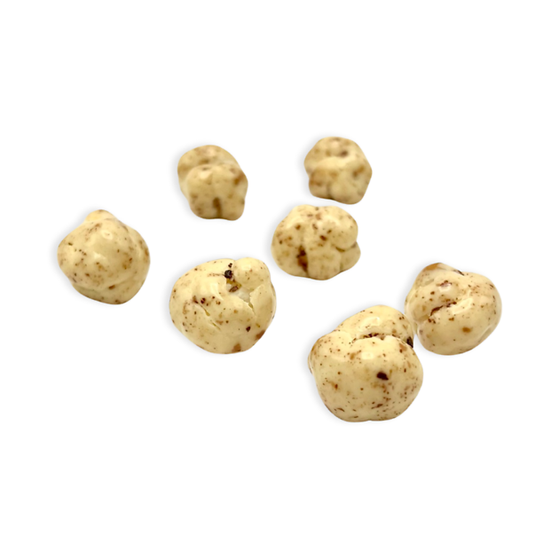 Description: Candied popcorn (30 %) covered with white chocolate (70 %) and with taste of toffee.