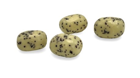 Ingredients: White chocolate (60 %): (Sugar, cocoa butter, WHOLE MILK POWDER, WHEY POWDER, LACTOSE, licorice extract, aroma (ammonium chloride), emulsifier (SOYA LECITHIN), natural vanilla aroma, glazing agent shellac, glucose syrup, modified tapioca starch, vegetable oil (coconut, rapeseed) in varying proportions). Licorice (40 %): (Sugar, WHEAT FLOUR, molasses, glucose syrup, licorice extract, salt, natural anise aroma, color agent (vegetable carbon).
